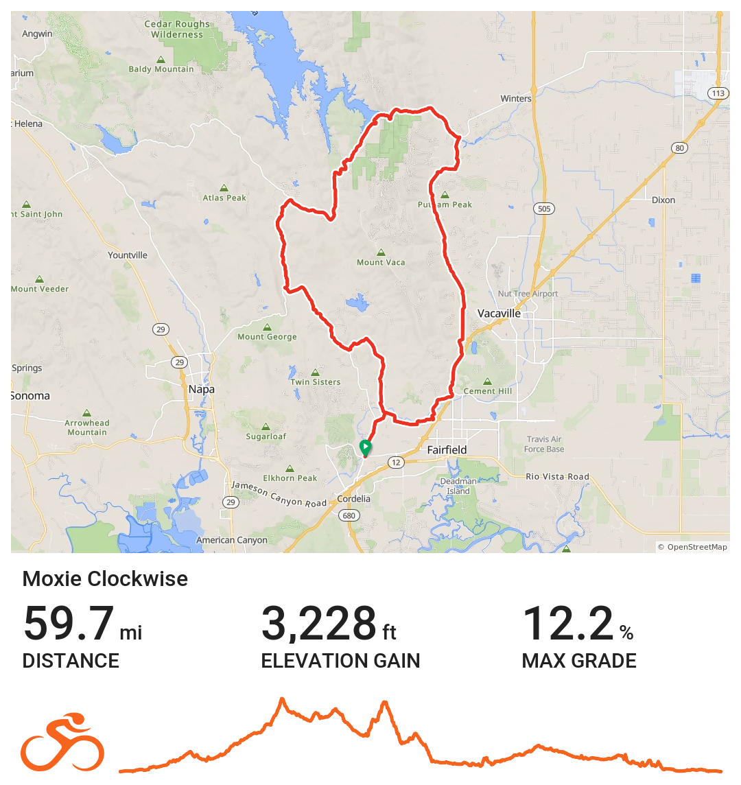 Do you know why we call it a “Moxie” ride? Someone asked me that a week before, and I didn’t know. The dictionary says it means: “confidence and determination.” I asked BBC member and historian, Steve Bahr about the origin of the BBC Moxie name, and he said that a former BBC member, Bob Klosterman, who now lives in Arizona, created the ride name a long time ago. There was at that time a bicycle ride in Davis around the same time of the year, called the “Davis Foxy” and apparently there is a beverage on the East Coast called a Moxie soda. Another BBC historian and member Mike Dunn informed me that the Moxie beverage is orange and tastes terrible! We have 2 Moxies per year, in the spring and the fall. In the spring just like daylight savings time, the ride would do a clockwise expedition around eastern Vacaville past Lake Berryessa. In the fall, just like daylight savings time, the fall Moxie route would be reversed in an anti-clockwise direction. In any event, that’s history. Wasn’t that fascinating?