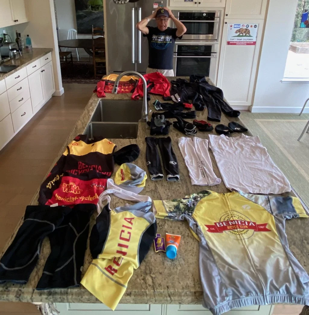 When I first began riding with the Benicia Bicycle Club I had a couple of pairs of standard black bike shorts, two bike jerseys, and some fingerless gloves. That was fine for warm summer days, but I would need more bike clothing for the rest of the year. As the days grew shorter and colder, I remember stressing about choosing the right clothes for the day. Overdressed: too hot!-underdressed freezing! Fortunately, after 9 years commuting by bike, 18 years with BBC, and 4 years of bike racing, I figured it out. In this article, I’ll share my insights about bike clothing for year-round riding. Much about bike clothing is a personal choice, but some items are essential.